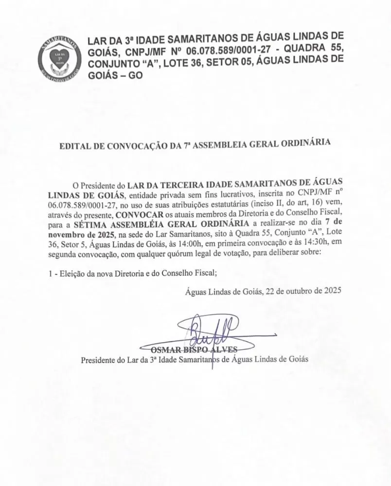O Lar da 3ª Idade Samaritanos, em Águas Lindas de Goiás, convoca seus membros para a 7ª Assembleia Geral Ordinária, que acontece no dia 7 de novembro de 2025, às 14h, na sede da instituição, no Setor 5.
